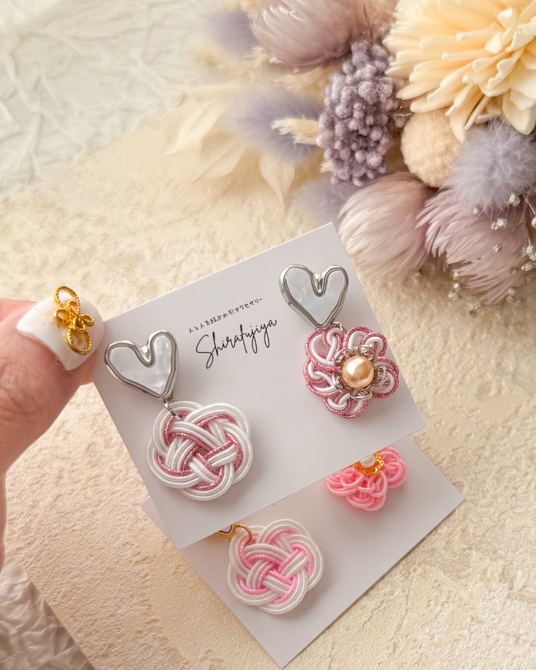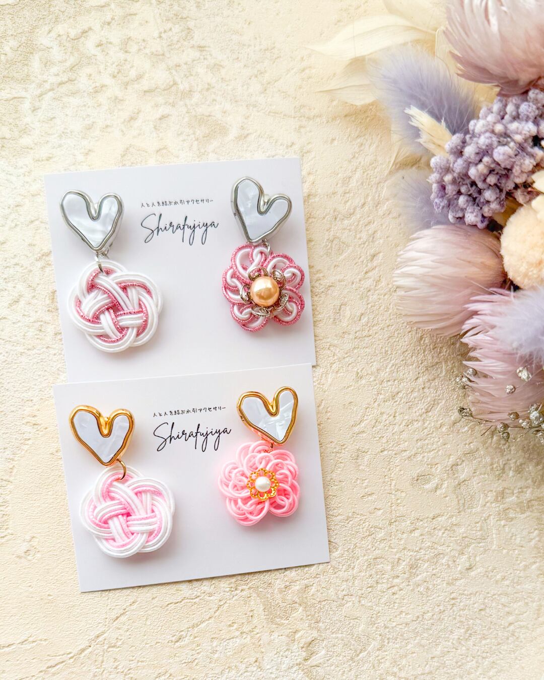 ハートと和結びの2wayピアス(梅結び×さくら結び)