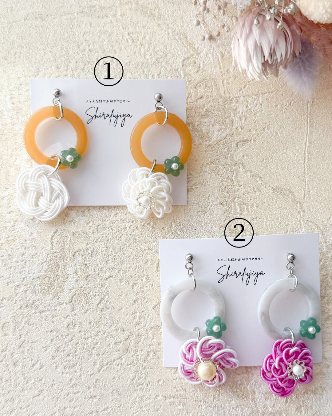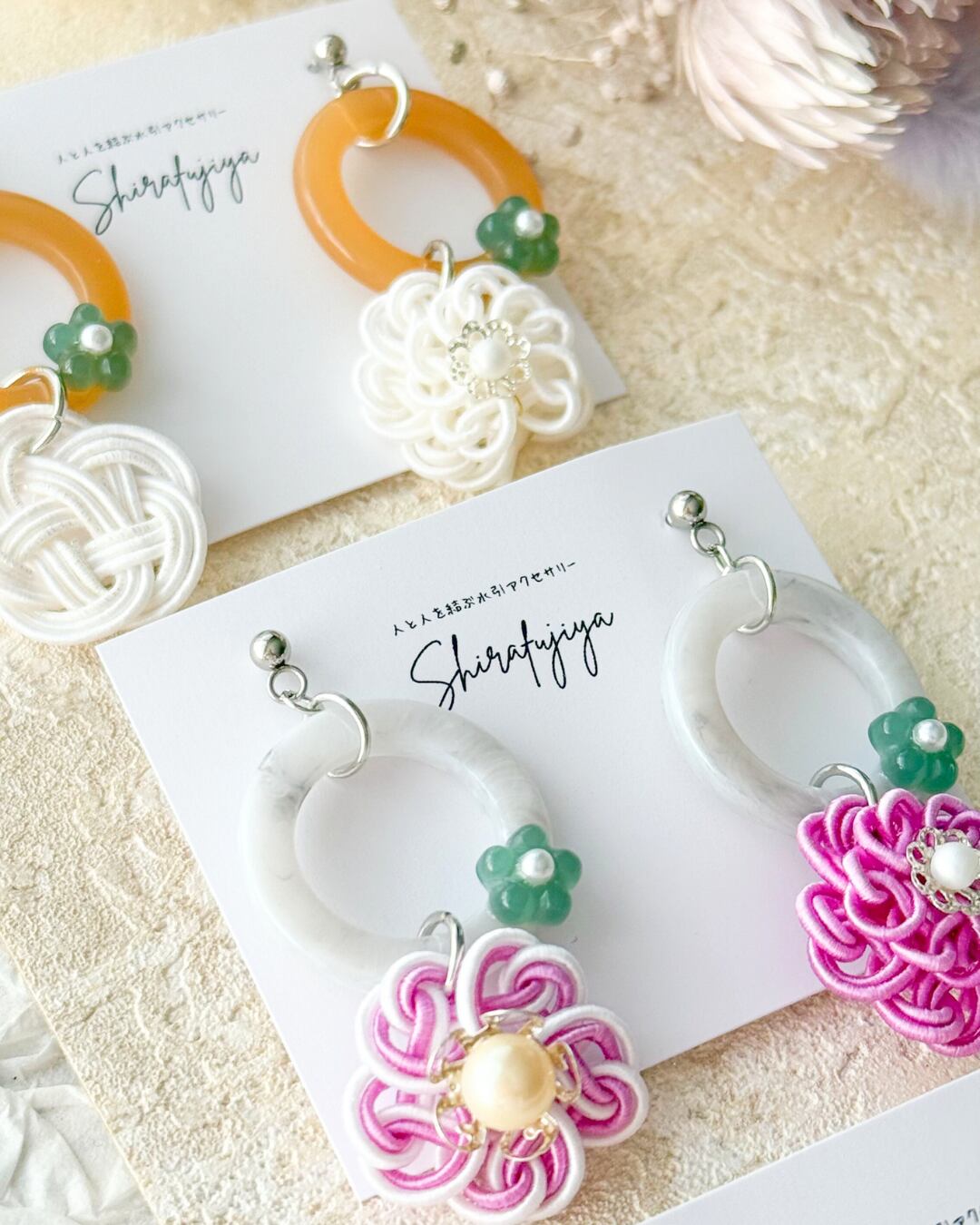 桜結びや梅結び、二重桜結びを組み合わせたアシメデザインのアクセサリーです
